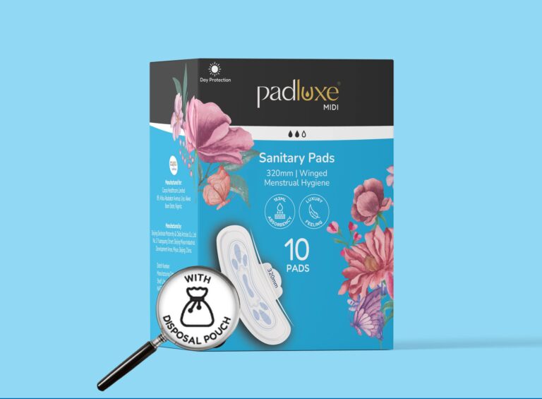 Padluxe® Midi is a high quality, highly absorbent sanitary pad for menstruation management. It’s designed with best-in-class materials and fabrics to leave you dry, prevent leakage, and remain safe for prolonged skin contact. Padluxe® is a registered trademark of Carpa Healthcare Limited.
