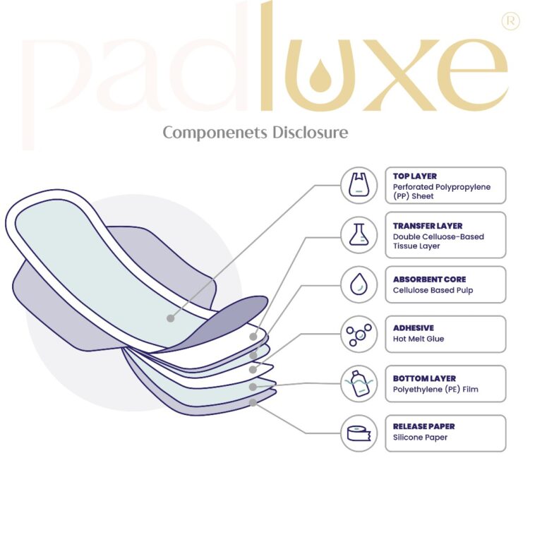 Padluxe® is made with 7 layers of hygienic coating fora soft, comfortable and luxurious feeling. These layers comprise of the top layer, transfer layer, absorbent core, adhesive, bottom layer, and release paper. This layered approach ensures consistent performance while keeping the product practical and affordable for everyday use.. The top layer is the part that stays in direct contact with the skin and has the following features. •Transfer Layer: Double-Layer Tissue • Absorbent Core: Cellulose-Based Pulp This is the main absorption engine of the pad and it is responsible for: •Adhesive: Hot Melt Glue Used to bond layers together and secure the pad in place. •Bottom Layer: Polyethylene (PE) Film This is the outermost layer facing the underwear and it ensures the following: •Release Paper: Silicone-Coated Paper This covers the adhesive before use and its useful for.